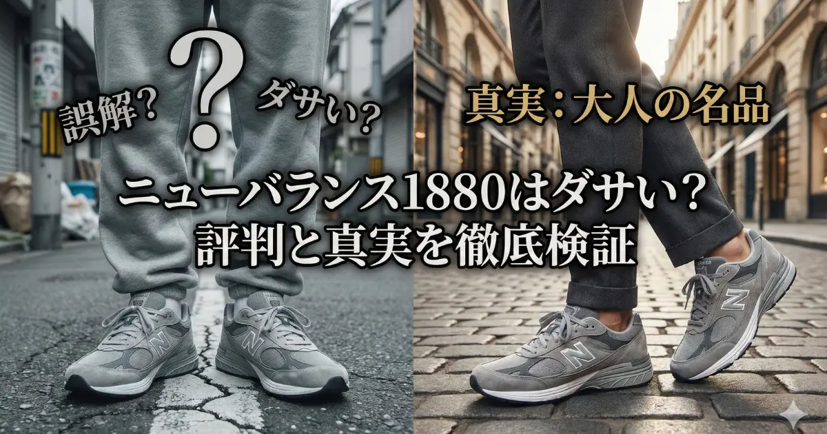 ニューバランス1880はダサいのか?その評判を徹底検証。ニューバランス1880がダサいと言われる理由や、失敗しないサイズ感、大人コーデ術まで網羅しました。 -
