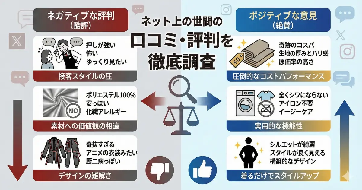 SNS(XやInstagram)、掲示板、ファッションレビューサイトなどをくまなくリサーチし、リアルな口コミを分析してみました。すると、評価は見事なまでに「絶賛」と「酷評」に二極化していることが分かります。ここでは、その両面の意見を包み隠さず紹介します。