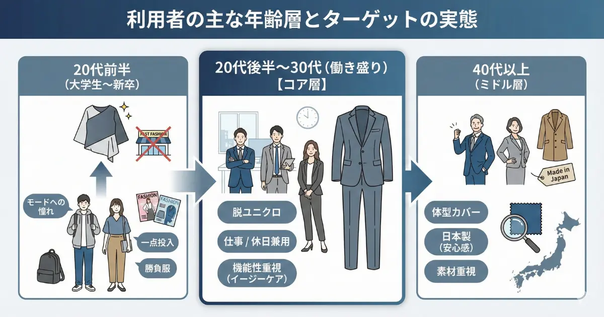 | 20代後半〜30代 (働き盛り) | 最も厚いファン層。「仕事でも使えるセットアップ」や「休日のきちんとした服」として購入。デザインだけでなく、シワになりにくい「イージーケア」などの機能性を重視して選ぶ賢い消費者が多いです。 |