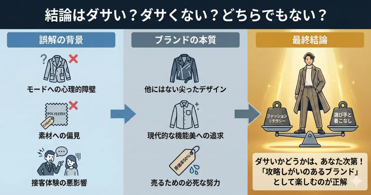 ここまで、評判、年齢層、骨格との相性など、あらゆる角度から検証を行ってきました。最終的な結論として、ユナイテッドトウキョウは「ダサい」のでしょうか?私の答えは、「決してダサくないが、着る人に一定のファッションリテラシーを求めるハイコンテクストなブランドである」というものです。