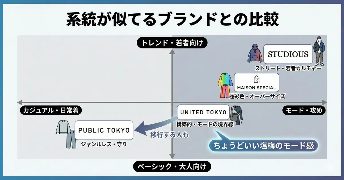こうしてマッピングしてみると、ユナイテッドトウキョウは「モードと日常着のギリギリの境界線」を攻めていることが分かります。パブリックトウキョウほど普通ではなく、メゾンスペシャルほどぶっ飛んでいない。この「ちょうどいい塩梅のモード感」こそが、多くの社会人に支持される理由なのです。