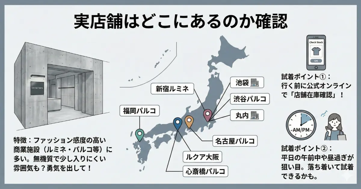 ネットでの評判や画像だけでは、生地の質感や微妙なサイズ感は分かりません。特にユナイテッドトウキョウのような構築的な服は、試着なしで購入すると「思っていたのと違う」となる可能性が高いです。そのため、可能な限り実店舗に足を運ぶことを強くおすすめします。