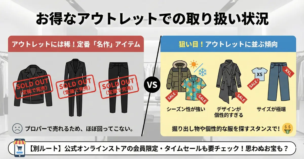 そのため、「定番品を安く買う」ためにアウトレットに行くというよりは、「掘り出し物があればラッキー」「個性的な服をお得に手に入れる」というスタンスで行くのが正解です。また、公式オンラインストアでも定期的に会員限定のセールやタイムセールが行われることがあるので、こまめにチェックしておくと、思わぬお宝に出会えるかもしれません。