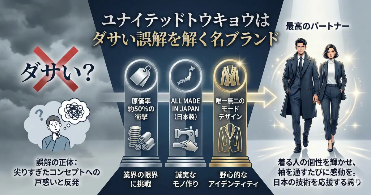 ダサいという評価を恐れず、むしろ「攻略しがいのあるブランド」として楽しむスタンスこそが、ユナイテッドトウキョウと付き合う上での正解だと言えるでしょう。